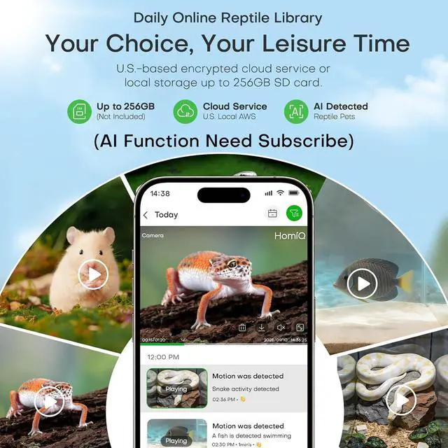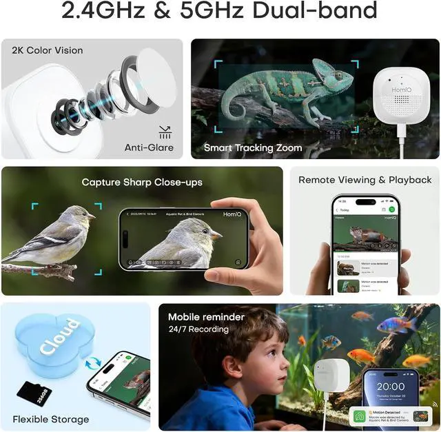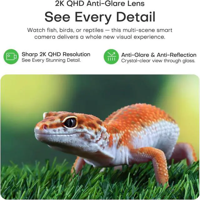 MONITOR TANK PET ANYTIME & ANYWHRE - You can watch your lovely pets via mobile App stream live HD video to your phone in seconds. Get instant alerts for motion, so you never miss feeding time, egg-laying, or your geckos midnight stroll, our camera is designed as 2.5 mm close-ups observing your pets' details. Easily spot early signs of illness or injury of the pets