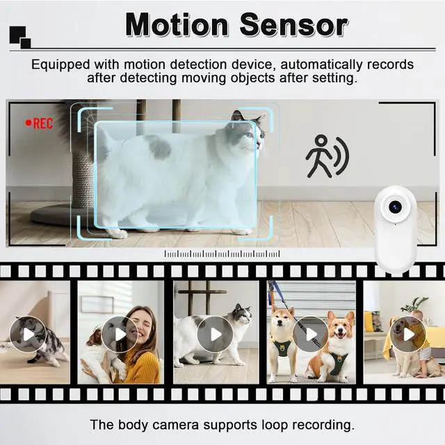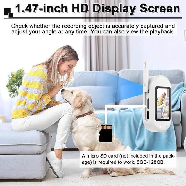 Magnetic design: This body camera can be attached to metal surfaces for flexible positioning. It also features a high-definition 1.47 -inch display for dynamic recording angles. Built-in motion detection automatically records your pet's activities, saving storage space.