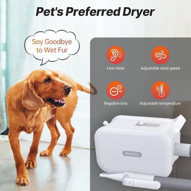 The pet dryer includes a flexible hose extension with a range of 80cm to 150cm, ensuring comfortable grooming while keeping you and your pet safe. The heat-insulated handle and thick hose provide added protection and comfort during use.