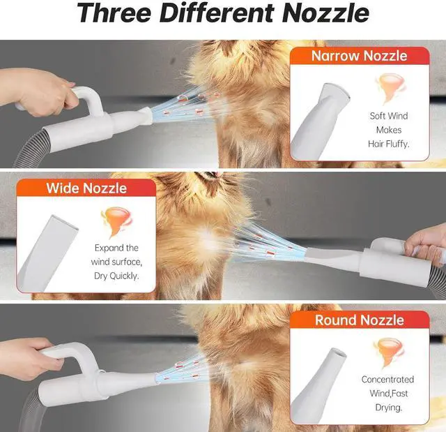 11 Reduce noise, reduce dust. Our cat and dog dryer sound is louder than a hand dryer, but not as loud as a vacuum. You can adjust the wind speed so that your pet can adapt to it. 9 x Retractable Hoses We adopt the humanized retractable hose design, the telescopic hose range is from 31.5" to 59.3". This ensures your operation is more convenient. 12 3 different nozzles. Our pet blower comes with different types of end nozzles. Fits both short-haired pets and heavy coat dogs. Meets all drying demands.