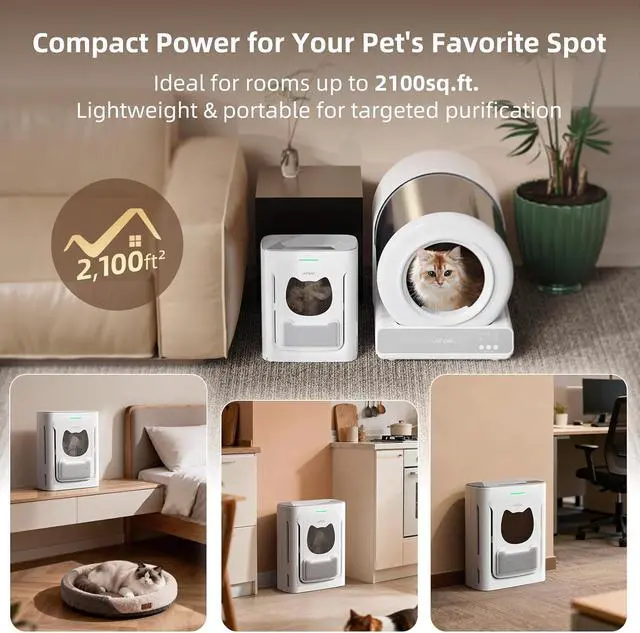 Smart Control & Quiet Operation: Compact Yet Powerful for 24/7 Use - Supports 2.4GH z WiFi and app control for real-time air quality monitoring and easy mode switching. Features air quality indicator light, auto mode, timer, and filter replacement reminders. Designed with a compact body and ultra-quiet 25dB sleep mode, it runs gently without disturbing skittish or sensitive pets. Perfect for bedrooms, pet rooms, or placing close to litter boxes for continuous targeted purification.