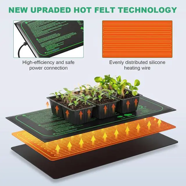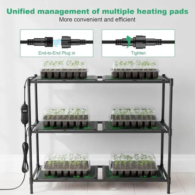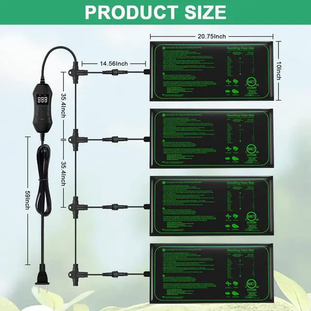 1. This 20.75 x 10 seed germination mat with a 59-foot power cord features a 4-in-1 design that avoids tangled wiring and allows for a maximum distance of 35 inches between heating pads. It operates at only 28 watts, offering both low power consumption and high efficiency. 2. The seed warming mat with temp control provides consistent and even heating at temperatures around 86~ 113.3. The seed mats for starting seeds temperature controller allows for accurate visual monitoring of the heating temperature. Upgraded arrangement of heating elements ensures even heating. 4.