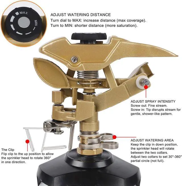 TOP DIAL FOR PRECISE SPRAY DISTANCE CONTROL: Use the clearly marked arrow guides on the top distance control dial to adjust the spray range to your exact requirements. Twist to the MAX setting for the large coverage (up to 90 feet in diameter) to water large areas, or switch to MIN for more concentrated saturation on small spots.