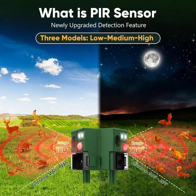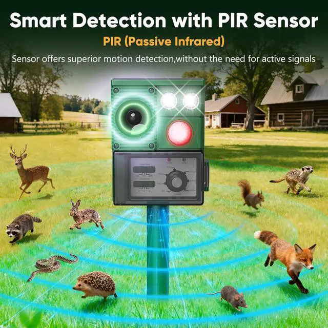 & - The advanced PIR sensor detects animal movement within a 110° angle, up to 30 feet (10 meters) away. Upon detection, the raccoon repeller triggers a powerful ultrasound sound and flashing LED lights, effectively deterring rabbits, raccoons, and other pests from invading your property. PIR (Passive Infrared) Sensor