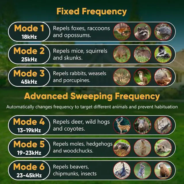 - This solar animal repeller offers 5 adjustable modes to tackle different pests: Mode 1: 18 kHz to ward off foxes Mode 2: 25 kHz to repel raccoons Mode 3: 45 kHz to deter bats and birds Mode 4: 13 -19kHz for larger animals Mode 5: 19 -23kHz to repel rodents and some birds