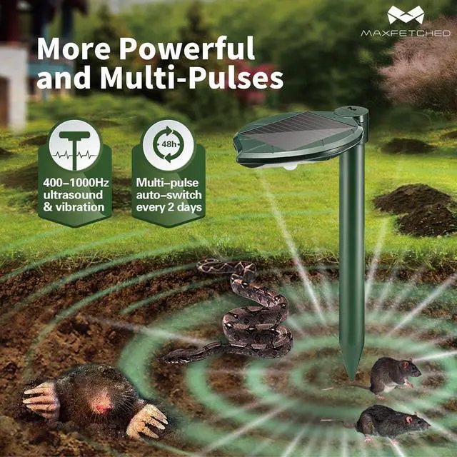 HIGH-EFFICIENCY SOLAR PANEL: Equipped with a large solar panel, this ultrasonic mole repellent for lawn is solar powered and comes with a rechargeable battery. Even on cloudy or rainy days, it can last up to 5-7 days and effectively repel snakes, moles, gophers, voles, groundhog. Find the best location for direct sunlight exposure and avoid shadow for optimum performance