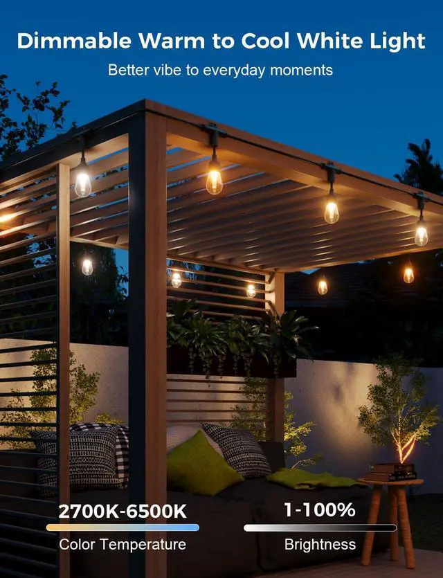 Connect up to 65 bulbs: XMcosy patio lights outdoor waterproof can be expended up to 196 feet with a single power adapter, making it easy to cover large spaces, decorate your spacious patios, yard, gazebo, balcony, fences, gardens, deck, and pools!