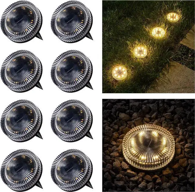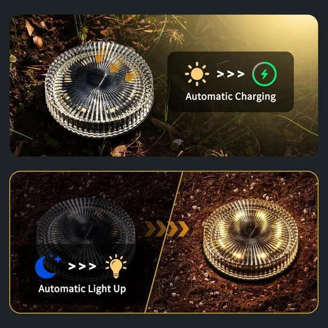 Automatic Efficient Lighting - Our solar garden lights are equipped with 8 spherical LED bulbs providing 25 lumens of warm light with even distribution. These LEDs feature a wide 120° beam angle that eliminates dark spots for more uniform illumination of your pathways and driveways. These solar powered disk lights automatically charge during daylight and illuminate from dusk to dawn, lasting over 10 hours on a full charge. The built-in light sensor ensures they turn on automatically when darkness falls and turn off when morning comes, requiring zero maintenance or manual operation.
