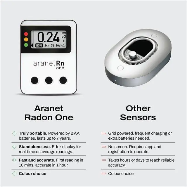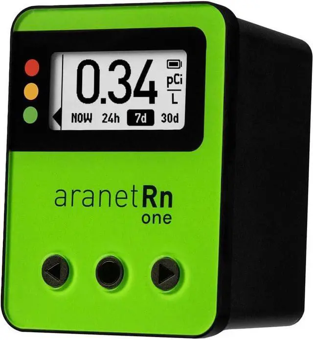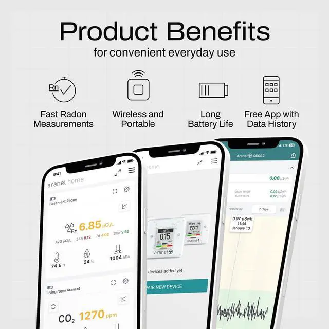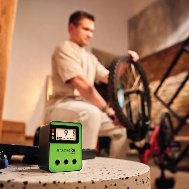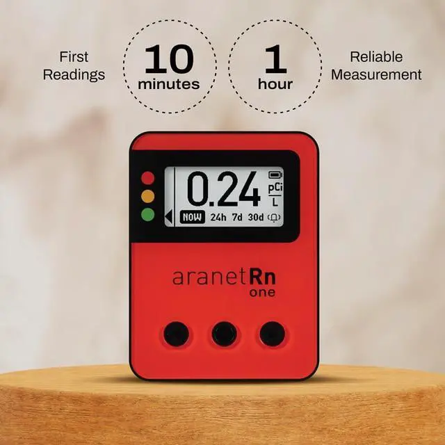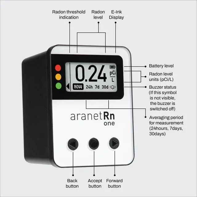 CONTINUOUS RADON LEVEL MONITORING Measures radon concentration in Bq/m³ and pCi/L, allowing consistent monitoring across different regions, including the US and Canada. Color indicators support easy interpretation of readings.