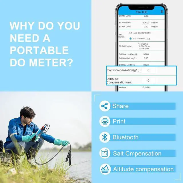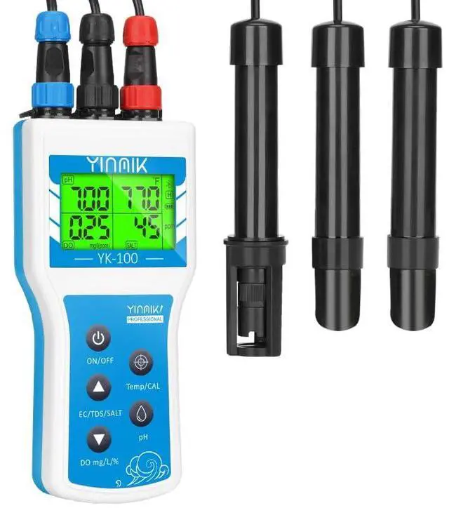 Wide Application: YK-100 Digital DO meter accurately measures dissolved oxygen (DO) in the range of 0- 200.0 % or 0-20mg/l, pH range 0.00 - 14.00, Salt range 0-2000ppm, 2.0 - 100.0 ppt, EC range 0.0 -1999S cm, 2.0 - 200.0 mS cm, and temperature range 32.0 - 122.0 /0-50°C. 6 in 1 DO pH Salt ppm Conductivity Meter is the good monitor tool for Aquaculture, Aquarium, Farm, Lab, Pool, industrial water quality checks, fish tank, koi pond, Making wine, Environmental monitor and so on.