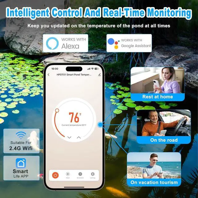 Smart Life: Compatible with Google Assistant and Alexa, allowing the whole family to share the joy of koi keeping. Whether it is family members or fish-keeping enthusiasts, they can easily manage and monitor the pond temperature through simple voice commands or the mobile app, adjust fish feeding plans in time, and bring more smart experiences to life.