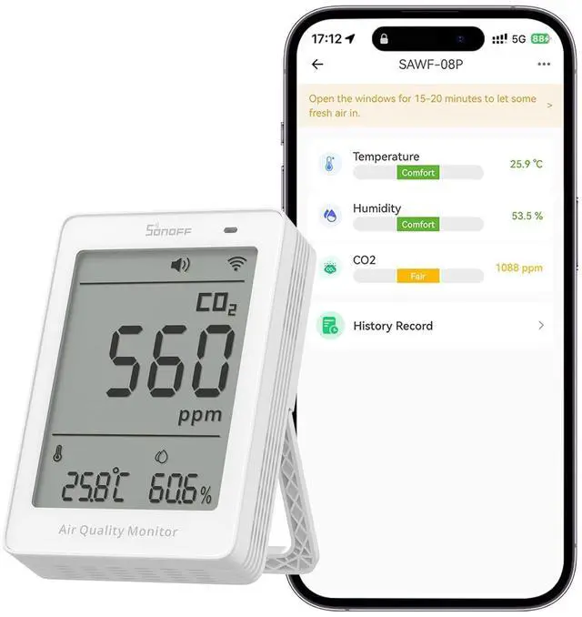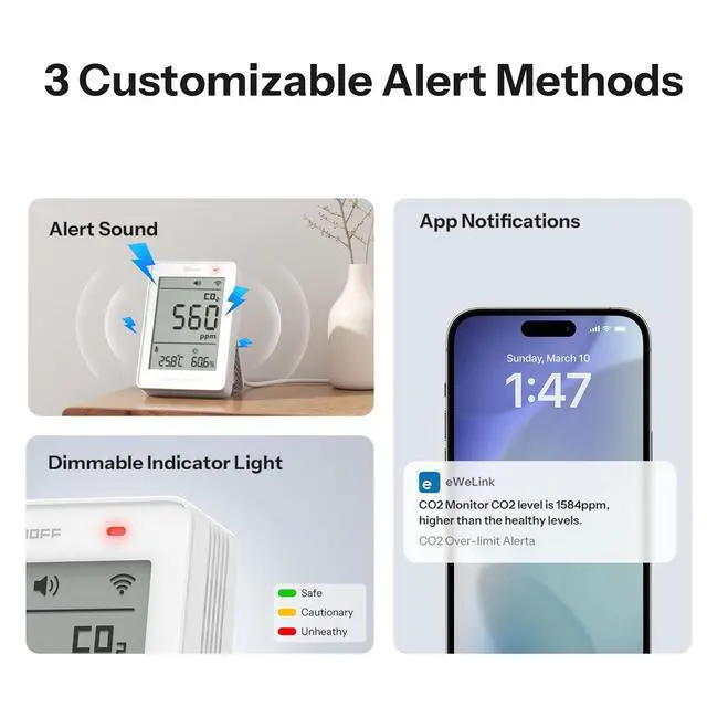 [Triple-Alert System for Air Quality Warnings] Get notified in three ways: via a sound alarm, a multi-color LED indicator, and app alerts. Customize all alerts through the eWeLink app to activate when CO2, temperature, or humidity exceeds your defined thresholds. Perfect for bedrooms, offices, and nurseries.
