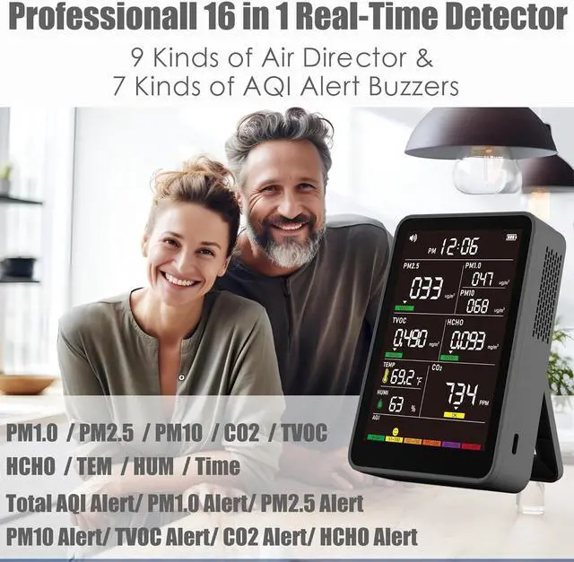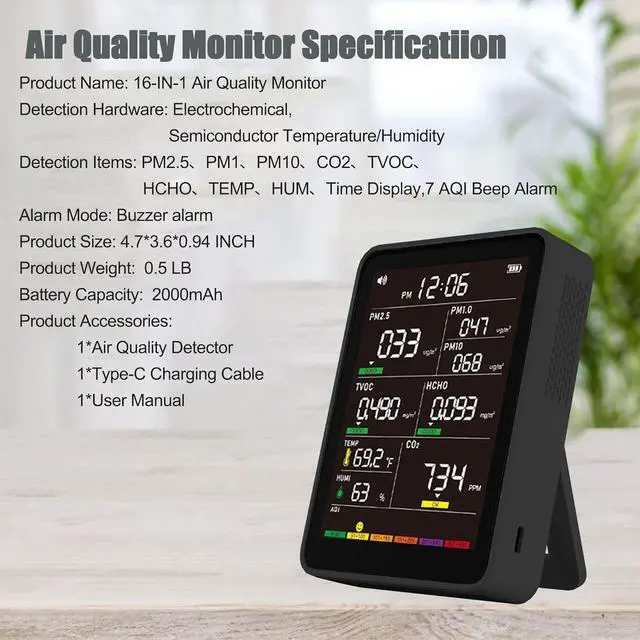 • Professional 16-in-1 Real-time Air Quality Monitor: With real-time detection of PM1.0 \ PM2.5 \ PM10 \ CO2 \ TVOC \ HCHO \ TEM \ HUM, along with 7 kinds of AQI alert buzzers function, this monitor ensures you always know what's in the air around you.