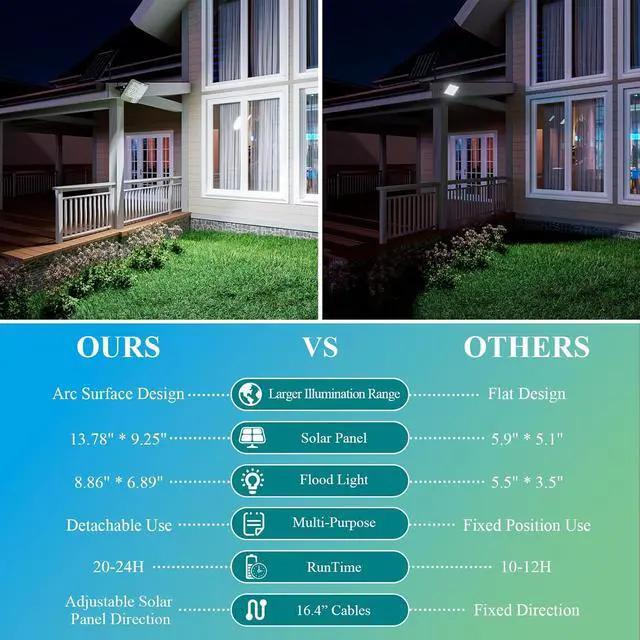 High Conversion & Works Longer Equipped with wide laminated polycrystalline solar panels, our motion sensor outdoor lights achieve a 20% high solar conversion rate. The large capacity battery ensures that these split outdoor wall lights can be fully charged in just 4-6 hours, providing up to 10-12 hours of bright illumination for your outdoor spaces