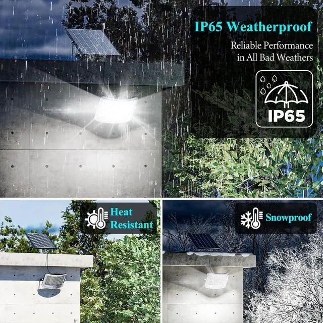 IP65 Waterproof & Durable Made from high-quality ABS material and featuring a durable lens cover, our solar motion lights are designed to withstand harsh weather conditions, including rain, wind, snow, ice, and extreme temperatures. These IP65 waterproof solar lights are perfect for your garden, driveway, patio, and other outdoor areas where reliable lighting is essential