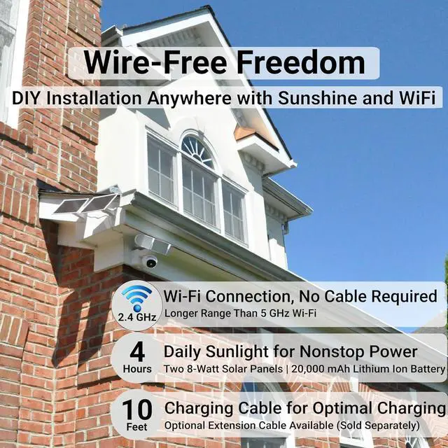 [Connected via 2.4 GHz WiFi] Install it anywhere with WiFi coverage and sunshine without the hassle of hardwiring. 2.4 GHz WiFi generally has a longer range than 5 GHz WiFi so you can put your camera further away from the router. For best results, ensure at least two-bar WiFi signal at the location where you mount the camera. Signal strength can be viewed in the app.