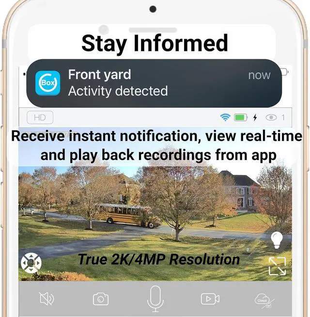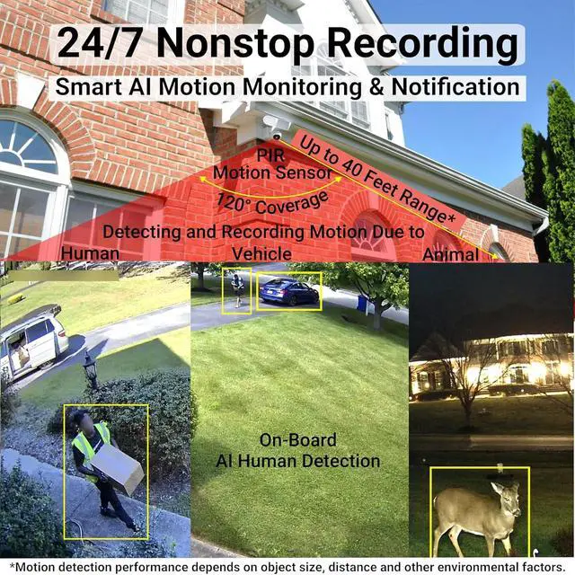 [Receive motion-activated notifications with AI human detection] Opt for receiving motion-activated notifications on your phone (or tablet) anytime and anywhere. Passive infrared motion sensor detects motion from large animal, human, vehicle, etc. up to 50 feet away. Turn on human detection to receive notifications caused by human only.