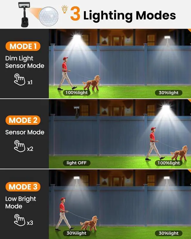 3 Smart Modes for All Scenarios. Dim-Bright-Dim / Motion-Activated / Steady Low Light. Detects humans & animals reliably. The solar motion lights outdoor waterproof easily detects movement from people or animals, ensuring reliable performance