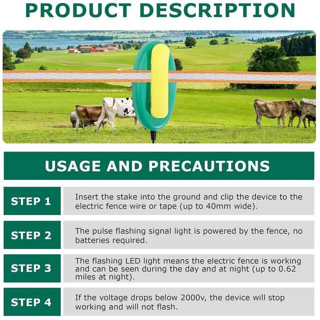 Cost saving: There are 3 high-brightness LED lights inside to ensure long service life and higher brightness. The visibility is up to 100 meters at night and up to 20 meters during the day. The sealed weatherproof shell is waterproof and UV-resistant, durable. Continuous monitoring, no need to reset. If the voltage is lower than 2000V, the electric fence indicator will stop flashing