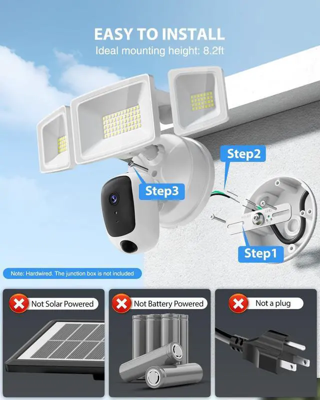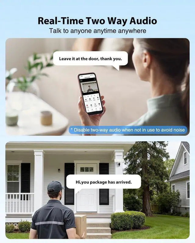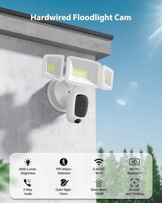 Real-Time Two-Way Talk & Voice Assistant Compatible: LED flood light camera with a built-in microphone and speaker for remote two-way communication through your phone. Talk to visitors, delivery personnel or warning intruders anytime from anywhere. Compatible with Alexa and Google Assistant, enabling voice control for a smarter and more convenient security experience.
