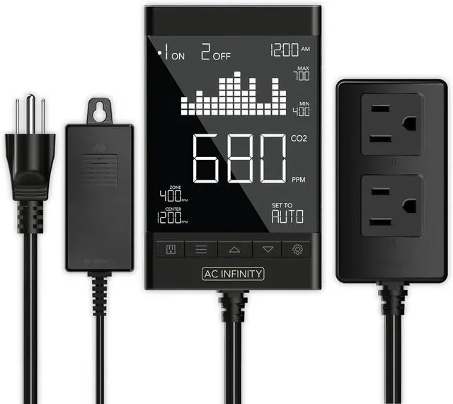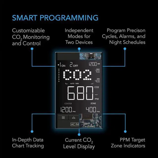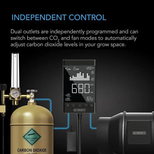 This smart CO2 controller includes two outlets to power and independently program CO2 regulators and exhaust fans. Able to support up to 1100W. Fit for use to monitor and adjust carbon dioxide levels in home and grow settings like greenhouses, grow rooms, grow tents, workrooms, labs, and more.