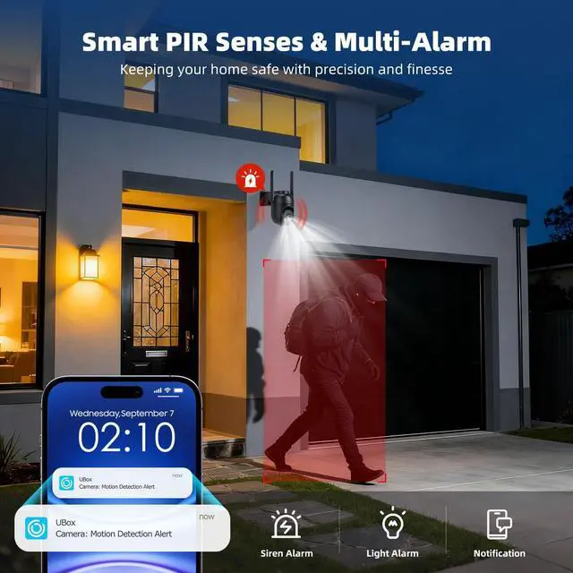Smart Motion Detection & Real-Time Alerts Security cameras wireless outdoor features an advanced PIR motion sensor that detects movement and immediately sends an alarm notification to your mobile phone when humans or animals are detected. Built-in microphone and speaker let you listen and speak through the app to deter intruders. If you turn on white light alarm & siren alarm, solar camera will also emit dazzling lights and sirens, and you can customize detection zones and sensitivity to reduce unnecessary notifications.