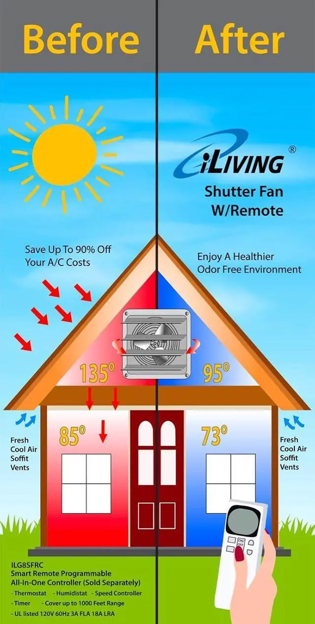 programmable remote controller kit, model# ILG8SFRC, is easy to covert or set up your shutter exhaust fan to a smart fan. This kit is equipped with a programmable thermostat, humidistat, solid state speed controller and timer. It allows the fan to cycle ON and OFF automatically at your desired settings. Dual temperature sensor for precision control that helps you to save big on your cooling bills. Capable of up to 1000 feet control range makes your installation easy and convenient. UL listed, 120V, 60Hz, 3A FLA, 18A LRA.