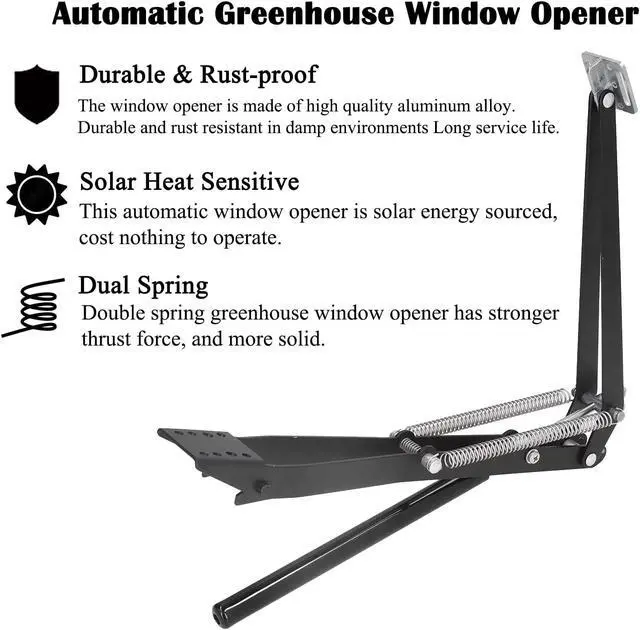PRECISE TEMPERATURE CONTROL: Operating between 15°C to 25°C (60°F - 77°F), the greenhouse window opener adapts to various weather conditions. Automatic window opener helps maintain an optimal growing environment inside the greenhouse with temperatures that neither get too hot nor too cold.