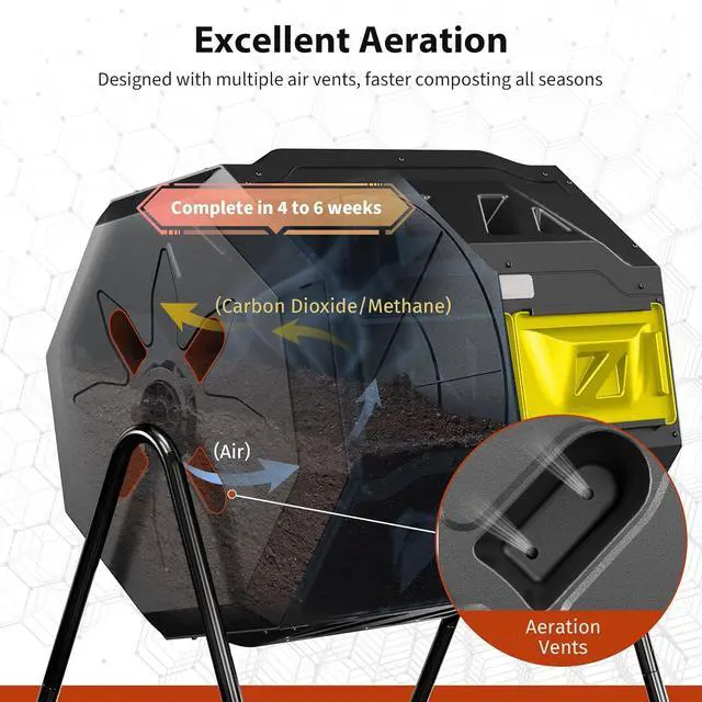 Compost Bin Outdoor, 43-Gal Dual Chamber with Steel Frame, Lagre Compost Tumbler with 2 Sliding Door and Aeration System, 360° Rotating, Tumbling Composter Bin for Kitchen, Garden, Yard, Black Yellow
