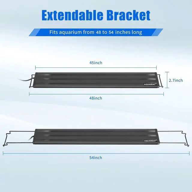 Work best on tanks with 48 inches long for full cover effect; with two extendable brackets, this light also fits for fish tank from 48 to 54 inches long; slim and sleek: save enough room for aquarium filters and other aquarium pumps; light body without docking brackets: 45" L x 2.7" W, easy to install on most glass or acrylic aquarium tanks with transparent hood/lid or no, with rims or rimless