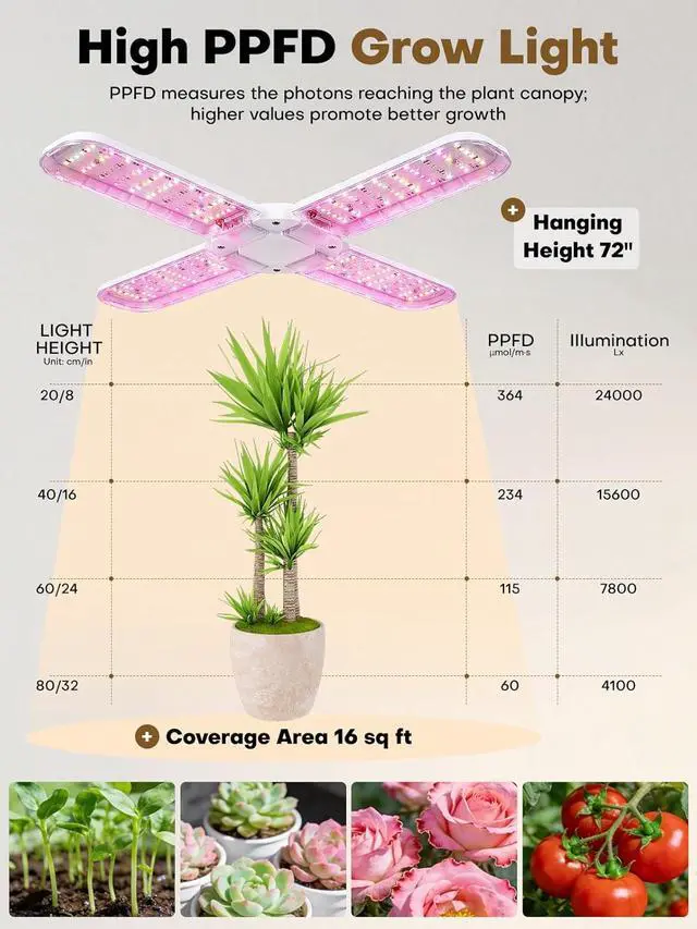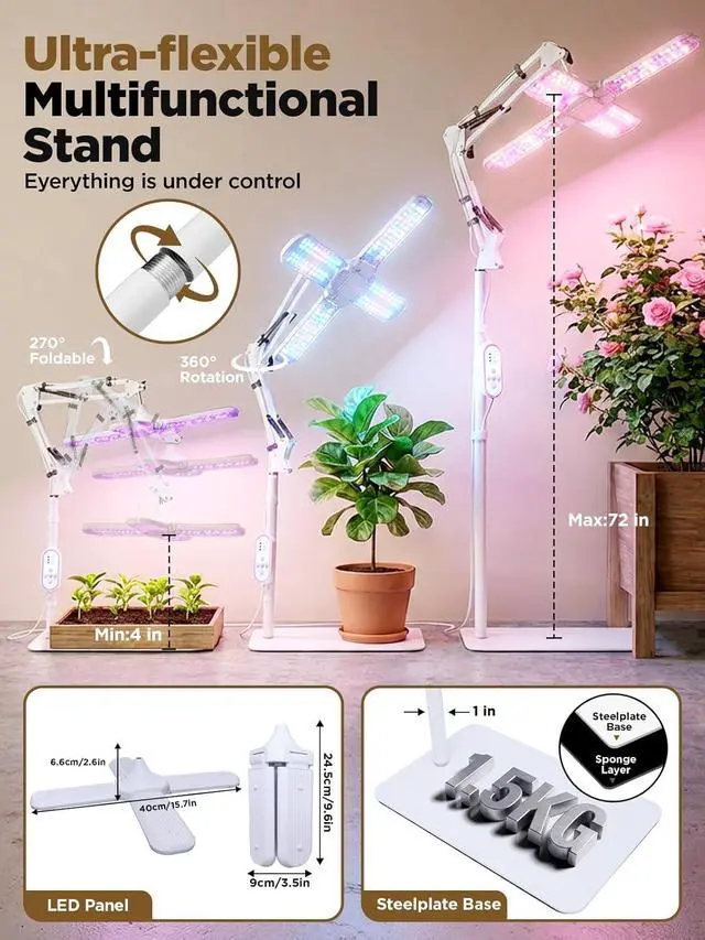 Angle: The grow light with base is designed with detachable poles, flexible arm and light head, which allows height adjustment from 24 to 72 inches and easily direct light angles where it's needed