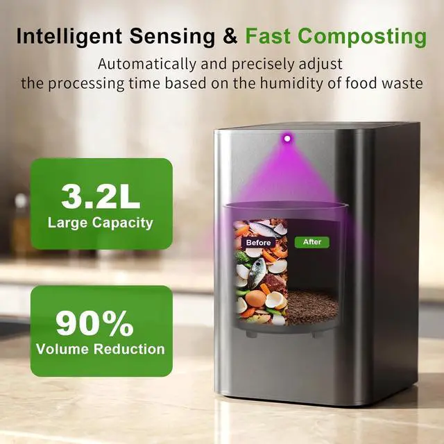 Electric Composter for Kitchen, 3.2L Compost Bin, Turn Food Waste into Fertilizer, Low Noise & Odorless, Food Waste Composter with LED Display, One-Touch Operation, Auto-Cleaning, EC04 (Black)