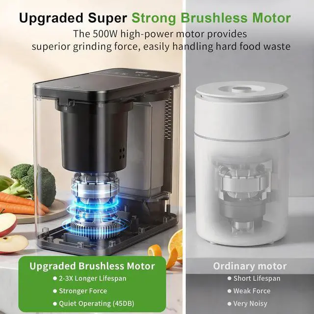 Smooth & Low-Noise Operation: Equipped with low-speed, high-torque blades, this compost machine can easily handle most daily food waste, whether it is eggshells, fruit peels, vegetable leaves, or harder materials such as small bones - no chunks, no clogging. And it operates at a noise level as low as 50-65 decibels, allowing you to run cycles at night then you could wake up to dispose of compost, saving your valuable daytime hours.