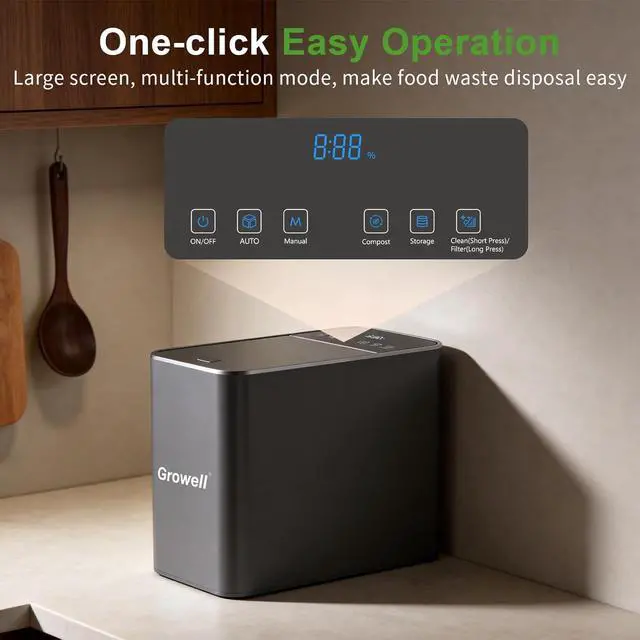 Efficient Processing: Equipped with AUTO and Manual modes, this composter adapts perfectly to food waste of varying moisture levels. Through grinding, high-temp drying, and cooling, it shrinking waste volume by up to 90%. In AUTO mode, the composter intelligently adjusts processing time based on waste moisture, finishing pre-composting in a maximum of 8 hours. Manual mode allows precise control from 1 to 10 hours for your ideal compost consistency.