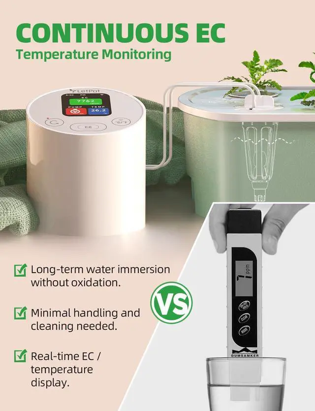 Versatile Hydroponic Assistant: The EC Monitor comes with a standard-sized hydroponic planting basket, making it compatible with most pods on the market, including, AG, and other desktop hydroponic systems. The detachable probe can be used independently, offering flexibility across various hydroponic setups and different water tanks, catering to diverse growing environments.