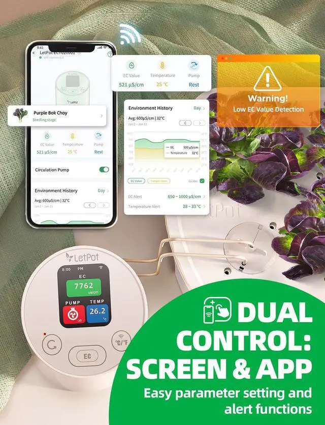 Water Shortage Detection & Smart Garden Alerts: In addition to EC and temperature monitoring, the EC Monitor also includes a water shortage detection feature. The probe can detect if your tank is running low on water and send notifications through the app, ensuring your indoor garden never runs dry. This feature turns your hydroponic setup into a smarter, worry-free system.