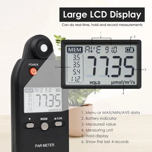 DATA DAGGED FUNCTIONWith a large LCD display, user can see the real-time PPFD levels and also the last 4 historical data on display. This Par meter can store up to 100 data measurements by manual saving at indexes 1 through 100 which is especially useful for monitoring and tracking changes in light energy levels in real time
