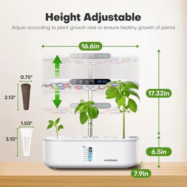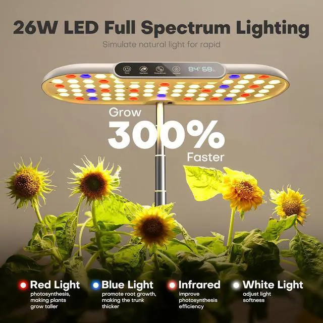17.3 in adjustable full-spectrum Led grow liht: indoor growing system with 2 smart modes and automatic day/night switching protects tall plants from light burn by extending the grow lamp to 17.3 inches; professional LED Grow Lights mimic natural light with 16-hour on/8-hour off, and a one-button "Vegetable Mode" (optimized for greens) and Fruits Mode (for fruits/flowers) increase plant growth by up to 30% with spectral adjustments. Advanced Indoor Hydroponics.