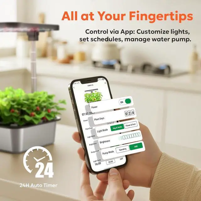 can: adjust the 24-hour light cycle/ automatic timer (default: 16H on/ 8H off), track growth days, and maintain perfect conditions. Nurture vibrant plants effortlessly and enjoy homegrown harvests. This indoor garden is designed for easy use, suitable for all ages.