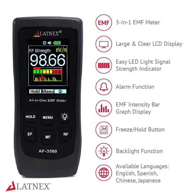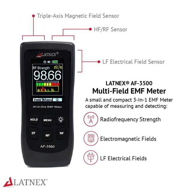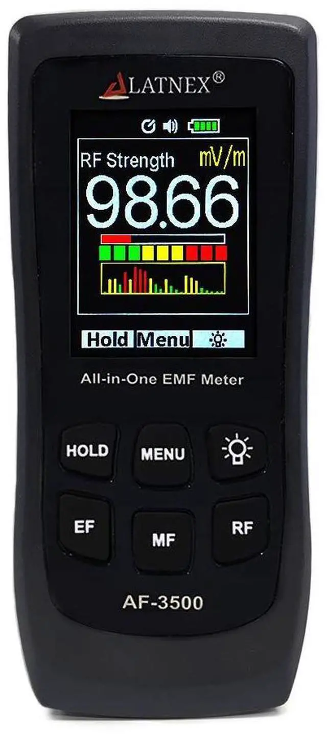 [ Outlined Features ] - RF Detector or RF Meter Mode - 50MHz~ 3.5GHZ; EMF Meter or EMF Reader for Electrical Field up to 2000V/M; Gauss EMF Meter 3-axis fields sensor; Manual data memory (Max & AVG) records, Alarm function with ON/ OFF