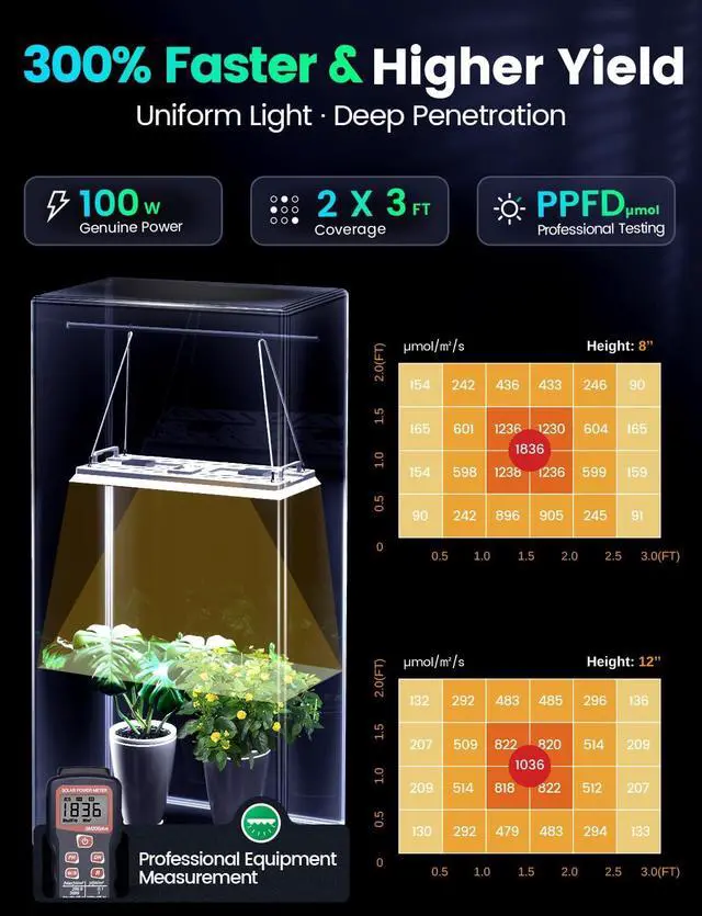 Aluminum Heat Dissipation, Certified: Our light uses unique aluminum honeycomb heat dissipation technology, which improves cooling efficiency by 50% compared to other products, without the issues of overheating or noise, allowing for extended, worry-free use. We prioritize product safety, incorporating rare power protection devices and holding multiple professional certifications, including CE, FCC, to ensure the well-being of your indoor garden.