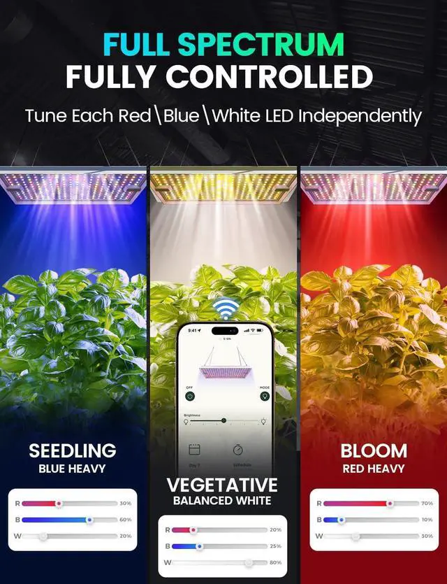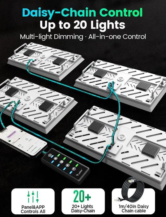 Daisy-Chain & Independent Light Control: Connect up to 20 grow lights via Daisy-Chain control and manage them easily through the app or the magnetic controller. Each light panel supports independent red, blue, and white brightness adjustment, allowing precise spectrum customization for different plant types and growth stages. Perfect for smart, scalable indoor gardening.