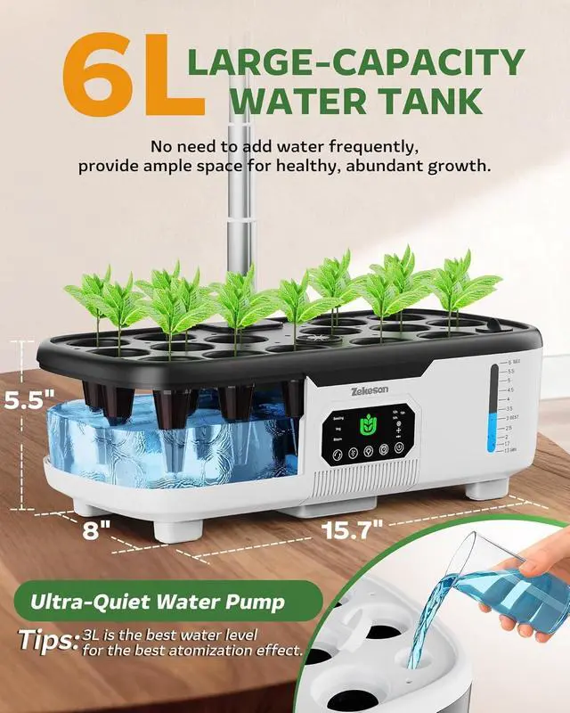 6L Large Tank&Low Maintenance CostsThe 15 Pods Hydroponic Garden Planter has a large 6L tank and transparent visible water level design, (3L is the most suitable water level). No need to add water frequently, removable water tank design makes easy to clean.