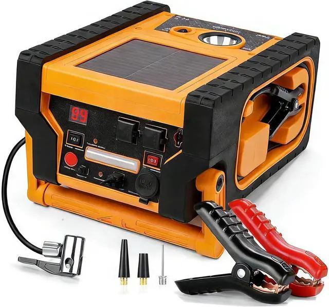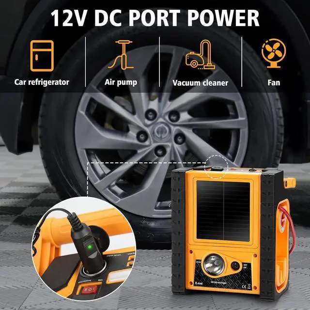 LED lights: a general floodlight and a bright spotlight, perfect for illuminating tasks such as inflating tires, jump-starting engines, camping, and handling emergencies. It is also a reliable power source during storm-related electricity outages.
