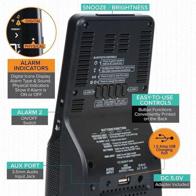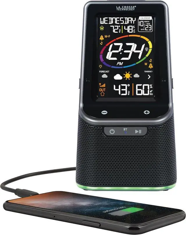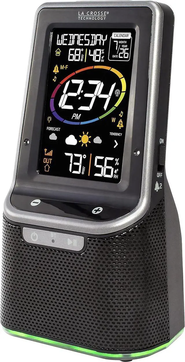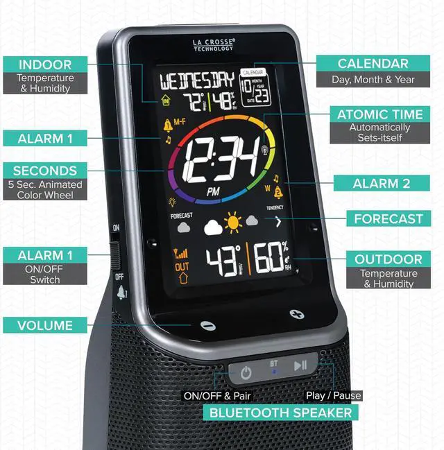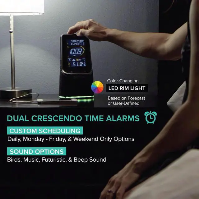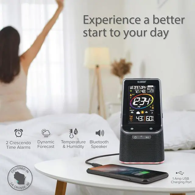 Let 3-in-1 Bluetooth alarm clock be your best companion! WAKE up each morning to your choice of 4 crescendo alarm sound options then easily sync to the Bluetooth speaker, using simple touch controls, and enjoy music from your own collection as you have your morning Coffee. Stay entertained by the color changing led base light you can set to change based on weather forecast, user choice of color, or changing colors in a loop. Don't lose power, charge your cell phone with the 1 amp USB charging port. You'll never lose track of time or date with this Self-setting atomic clock and the perpetual calendar that sets itself! the indoor/outdoor temperature and humidity icons let you know the current weather, and the forecast icons tell you what to expect as the day goes on.
