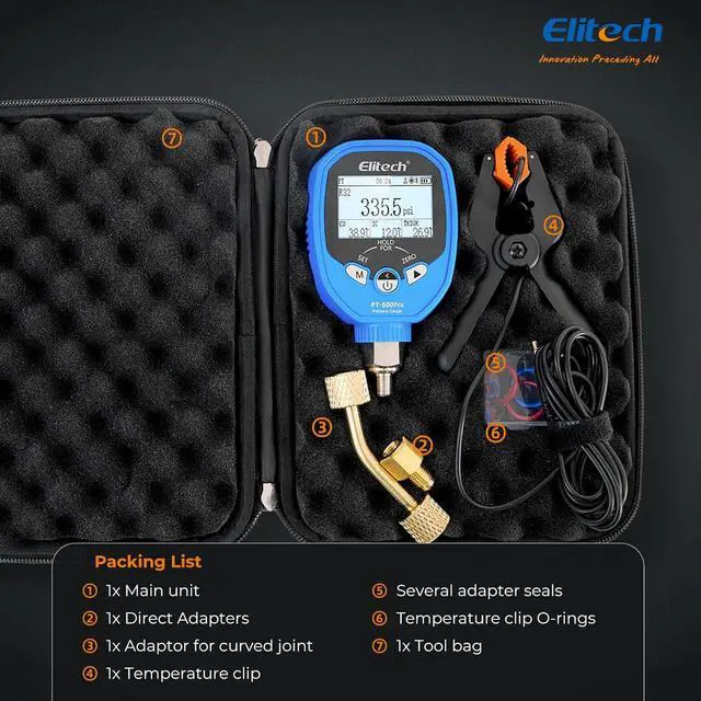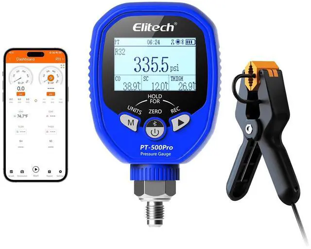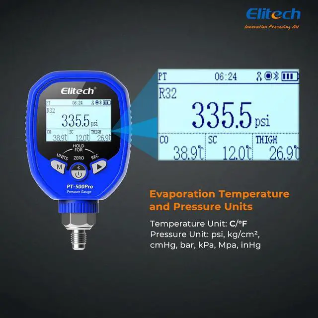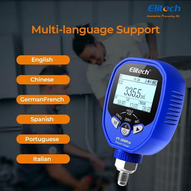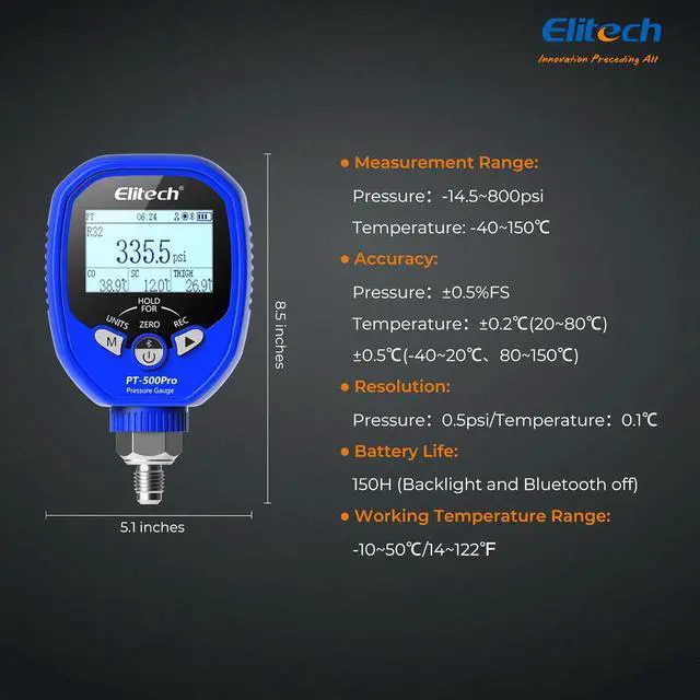 ROBUST LOW-PRESSURE SPECS Designed for the low-pressure side with a wide measurement range of - 14.5 to 800 psi, protecting the sensor against unexpected surges. The unit features a clear dot matrix screen, standard 1/8" NPT interface, and is powered by 3x AA batteries offering approx. 150 hours of operation.