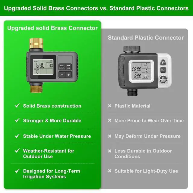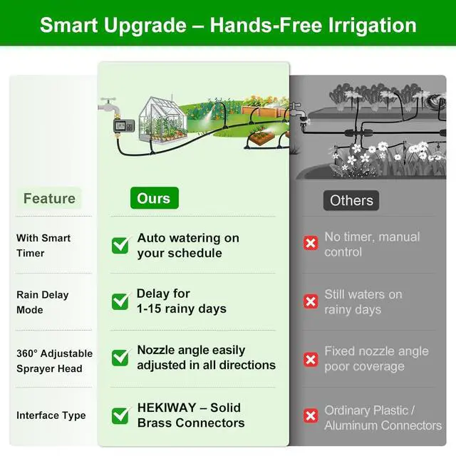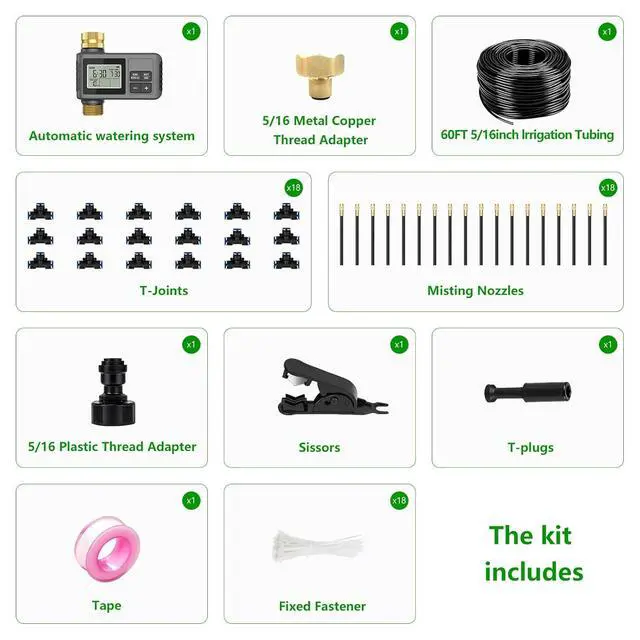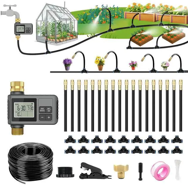. [60FT Complete DIY Irrigation Kit Designed for All Garden Sizes]This 120FT all-in-one irrigation kit includes a smart timer, adjustable sprayers, bendable tubing, brass connectors, and installation accessories. Suitable for flower beds, vegetable gardens, lawns, greenhouses, and potted plantsan easy upgrade to efficient, worry-free watering.