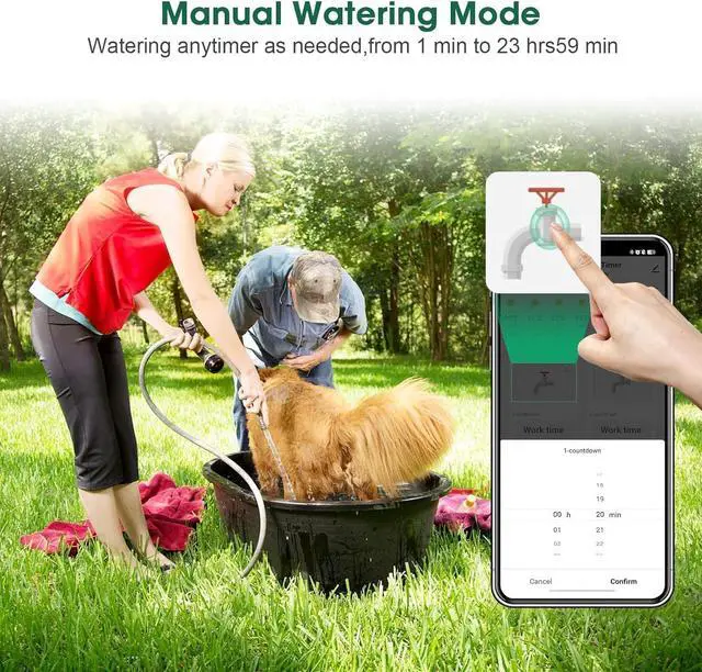 Manual Watering & Rain Delay: In manual mode, you can water anytime as needed, with customizing time from 1 min to 23 hrs59 min and without interrupting the preset watering schedule. With rain delay mode, your programmed schedule will be paused for 1~7days, and will be automatically resumed.