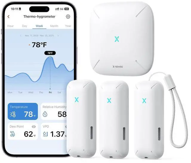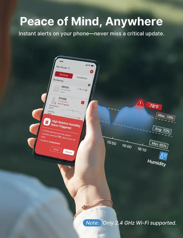 Monitor Your Whole Home: Link up to 50 devices to one base station, including a maximum of 10 thermo-hygrometers, with wide coverage up to 1700ft (500m); monitor your entire home, from bedrooms to basements, and receive instant alerts on your phone anytime, anywhere