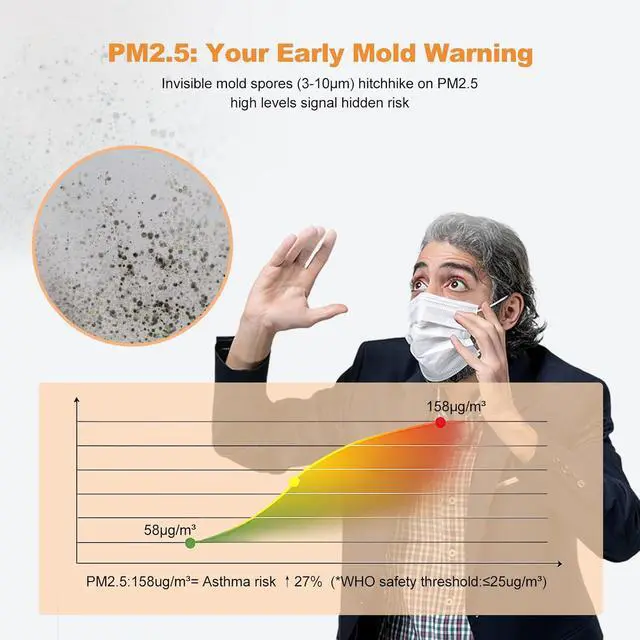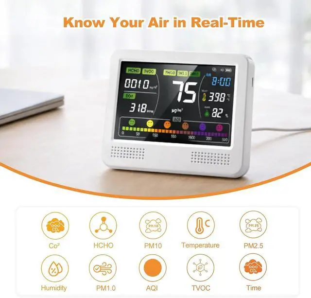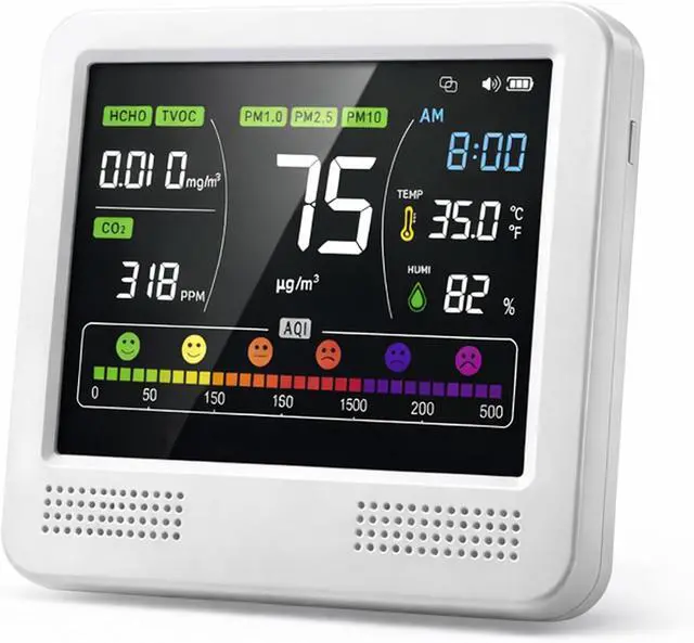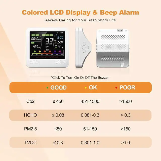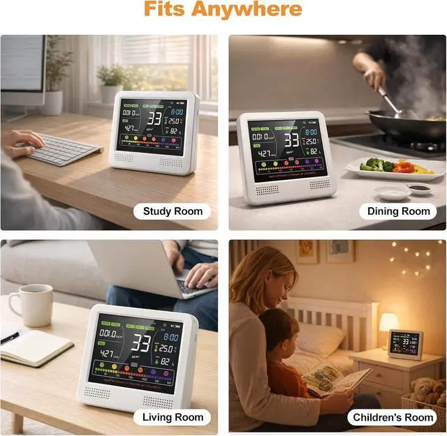 3. [7-Level Visual AQI Alert System] Color-Graded Display with Configurable Audio Alerts Equipped with a real-time color screen that shifts across seven levels based on AQI values, the monitor provides clear visual feedback on air quality changes. Users can enable or disable sound alerts according to specific scenariossuch as during sleep, meetings, or focused workenabling undisturbed monitoring in bedrooms, shared offices, and other quiet environments.